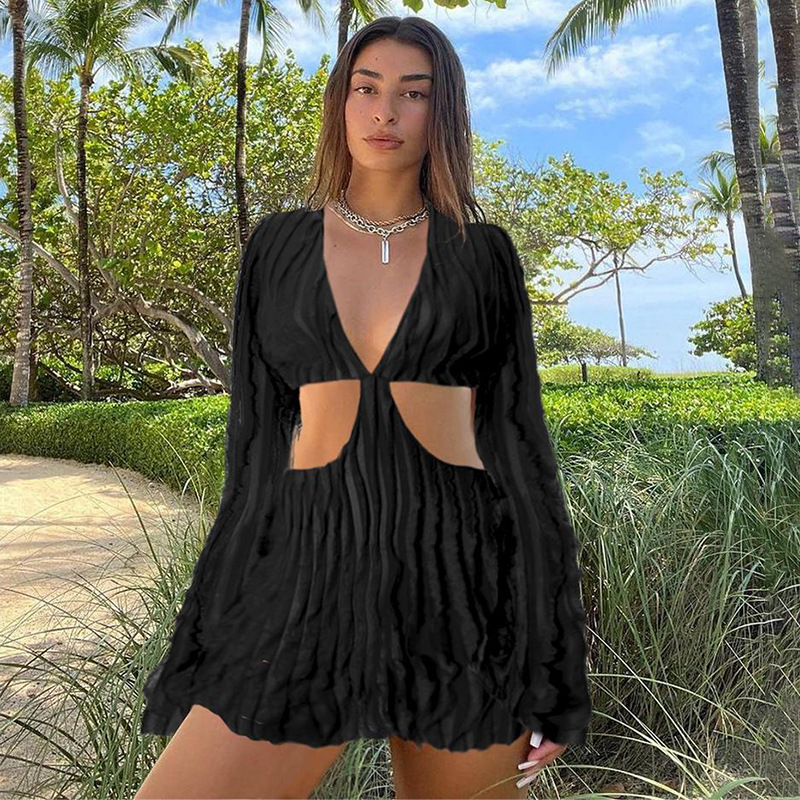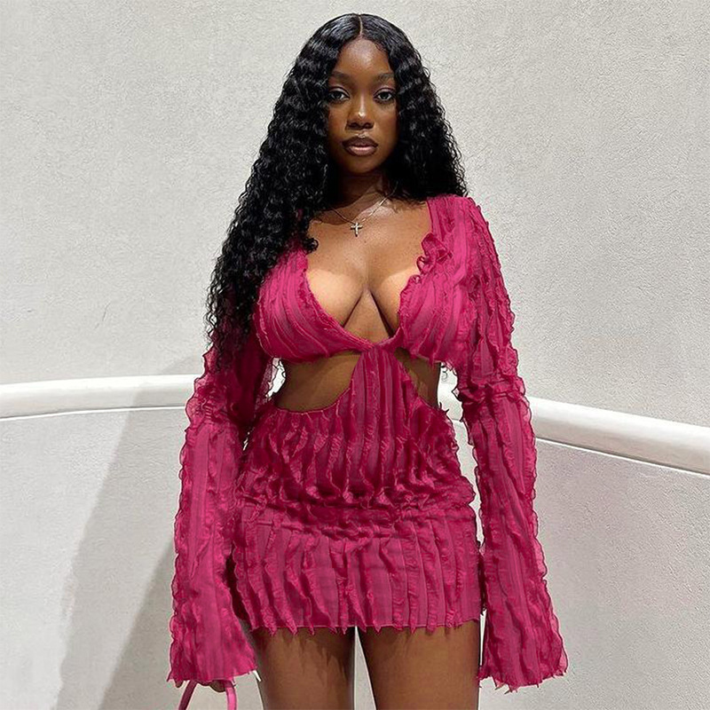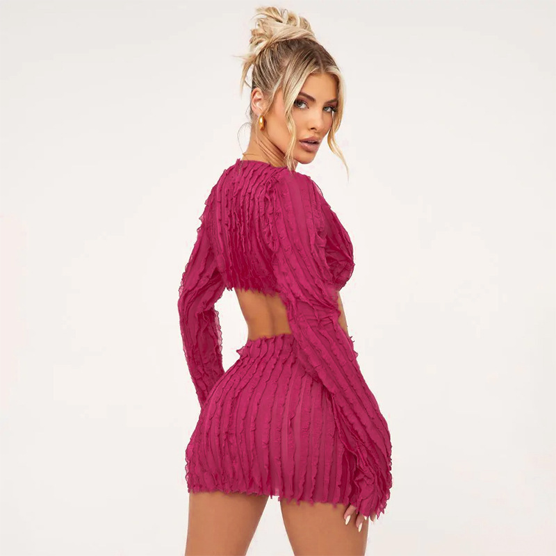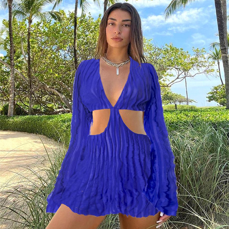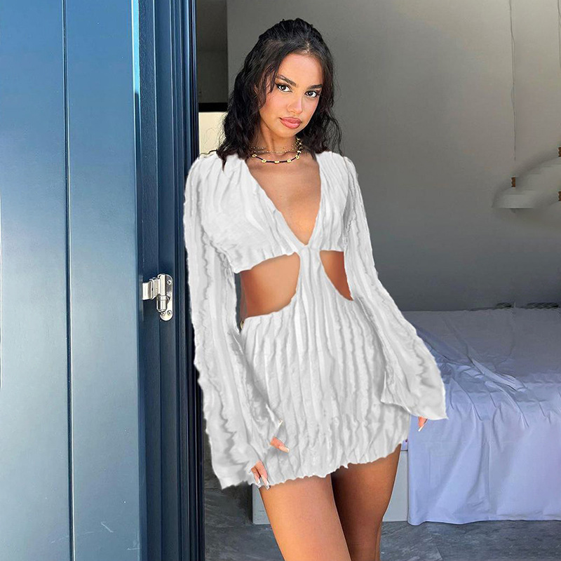 F5026 Cross-Border European and American Style Women's Clothing 2023 Autumn New Amazon Fashion Mesh Wave Pattern Sexy Sheath Dress